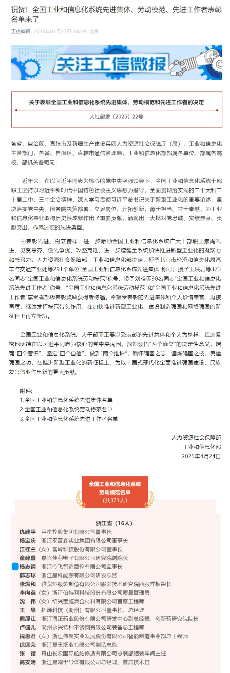 今日,为表彰先进、树立榜样,进一步激励全国工业和信息化系统广大干部职工崇尚先进、见贤思齐,创先争优、攻坚克难,进一步增强全系统加快推进新型工业化的凝聚力和感召力,人力资源社会保障部、工业和信息化部决定表彰全国工业和信息化系统先进集体、劳动模范和先进工作者,浙江尊龙凯时人生就是搏智造摩轮有限公司杨志钢荣获“全国工业和信息化系统劳动模范”称号。